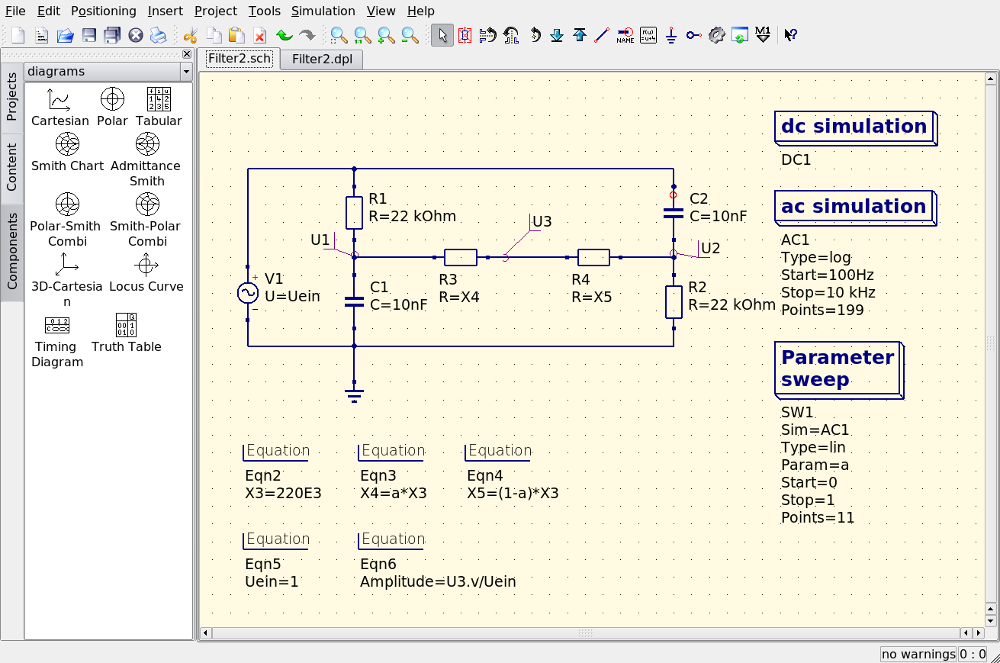 Die Wiederstände R3 und R4 bilden zusammen ein 220kΩ-Potentiometer, dessen Stellung durch den Parameter a∈[0,1] beschrieben wird. Berechnet werden die Amplitudenfrequenzgänge für die Parameterwert a=0…1 mit der Schrittweite 0,1. Für den Paramterwert a=0,5 hängt die Verstärkung (bzw. Dämpfung) nicht von der Frequenz ab. Das nachfolgende Bild zeigt das Qucs-Fenster.