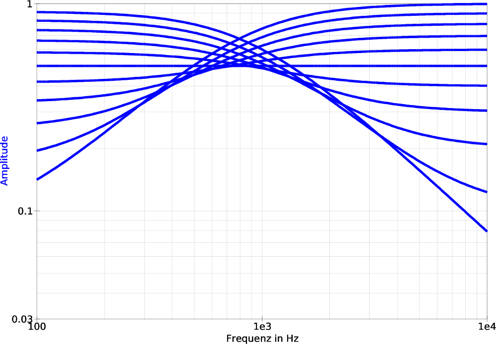 Eine Klangwaage ist ein spezieller Klangregler, bei dem man mit einem einzigen Potentiometer zwischen Höhen- und Tiefeneinstellung wechseln kann. Die in Anlehnung an [1] entworfene Schaltung besteht aus zwei (dynamischen) Spannungsteilern, wobei einer als Hochpass und der andere als Tiefpass agiert. Mit einem Potentiometer kann man zwischen diesen Ausgangsspannung überblenden. Diese Schaltung wird auch in [2] zusammen mit der Doppeltriode ECC82 eingesetzt.